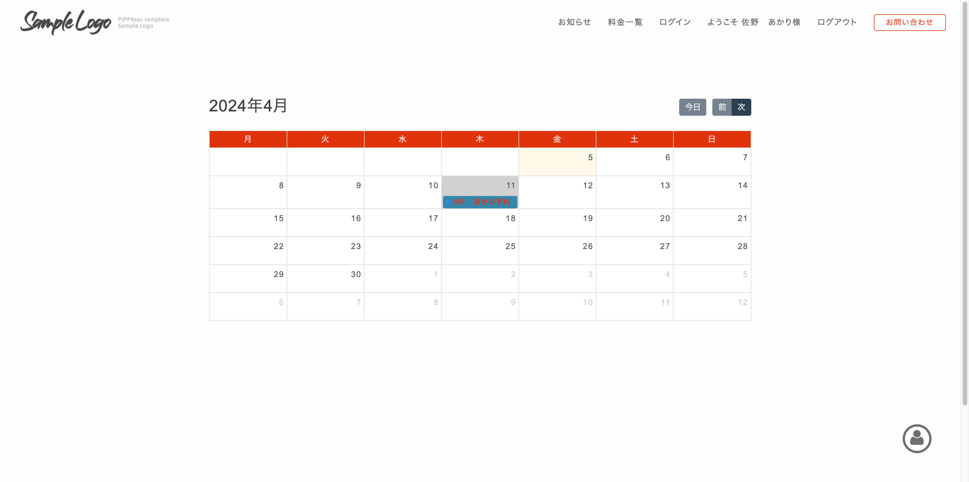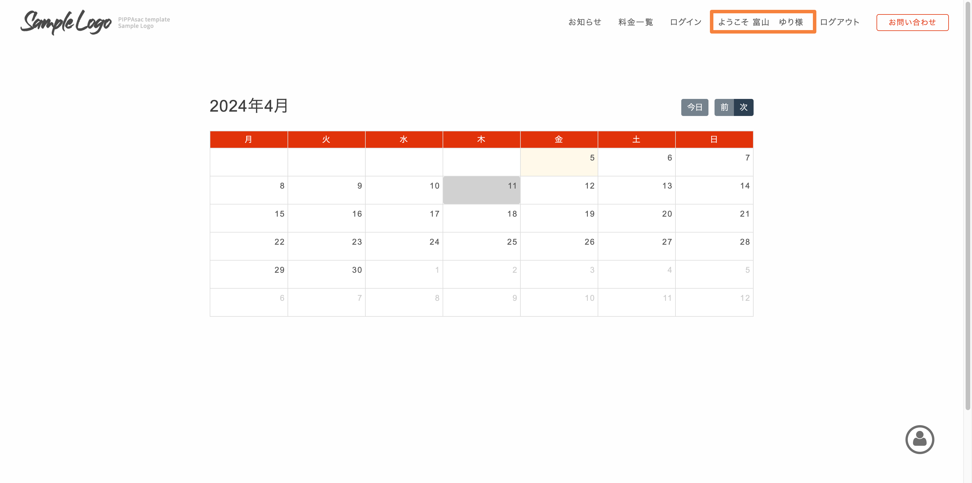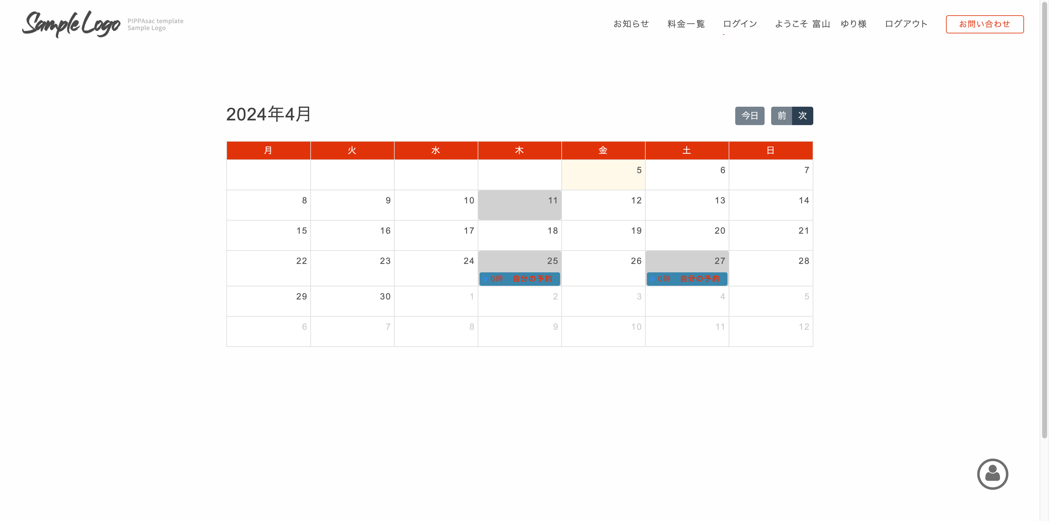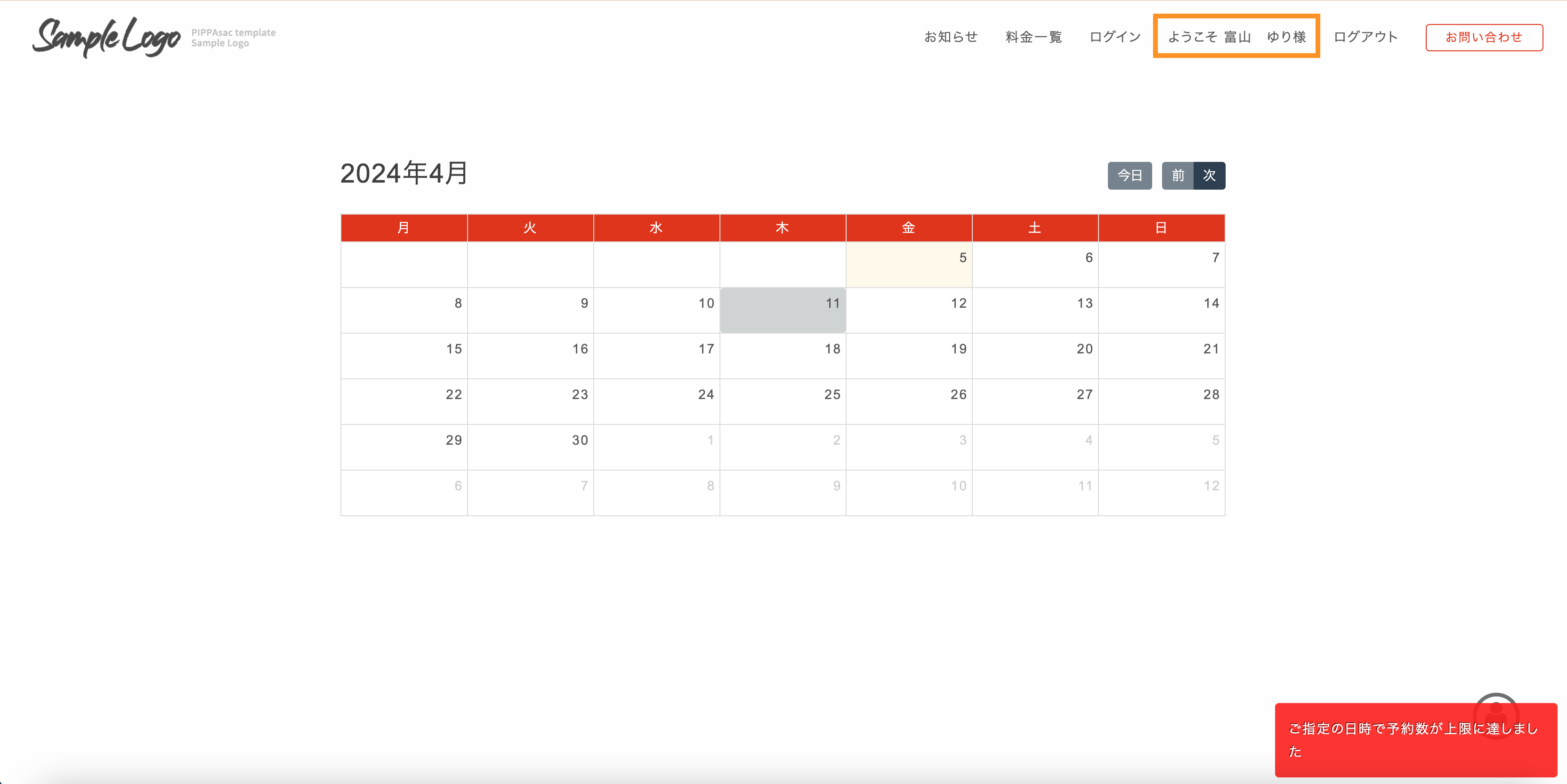 4/11 がグレーに変わっている箇所は他の予約が入っていることを表示しています。