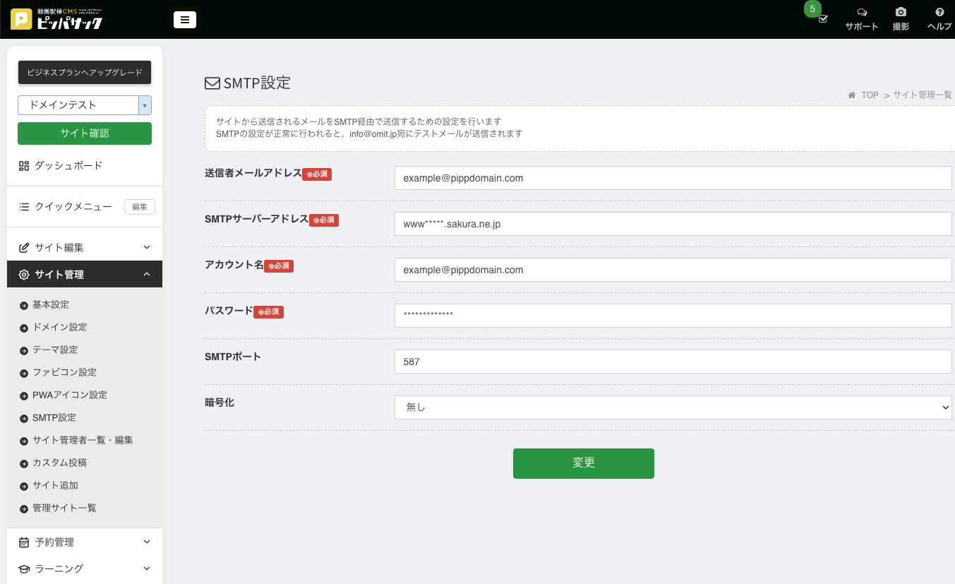 サイト管理 SMTP設定 SMTP設定を行うと、PIPPAsacで作成したサイト(お問い合わせフォーム...