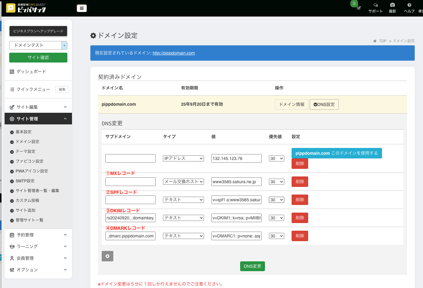 | サブドメイン | 他社サービスでDMARC設定した際の、レコード情報をご参照ください。(例:_dmarc.pippdomain.com) |